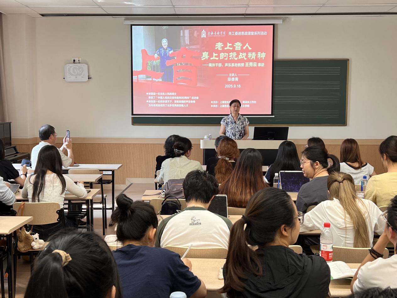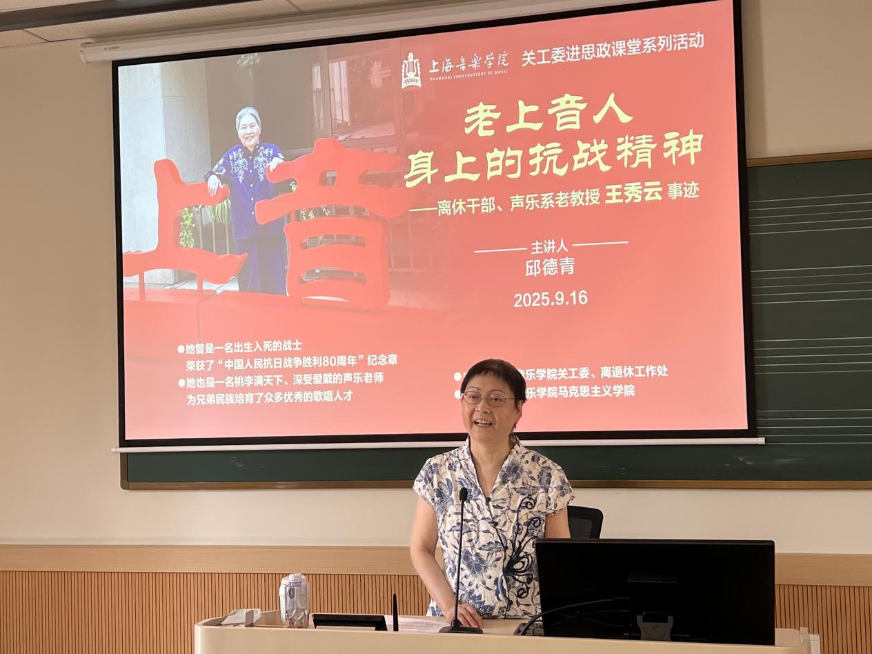 为纪念中国人民抗日战争暨世界反法西斯战争胜利80周年,学习贯彻习近平总书记在纪念中国人民抗日战争暨世界反法西斯战争胜利80周年大会上的重要讲话精神,聚焦“铭记历史、缅怀先烈”教育目标,2025年9月16日,由上海音乐学院关工委、离退休工作处主办,马克思主义学院承办,特邀上海音乐学院已故离休干部、声乐系副教授王秀云之女邱德青,走进马克思主义学院李敏老师的思政课堂,为学生讲述王秀云老师这位老上音人身上的抗战精神。