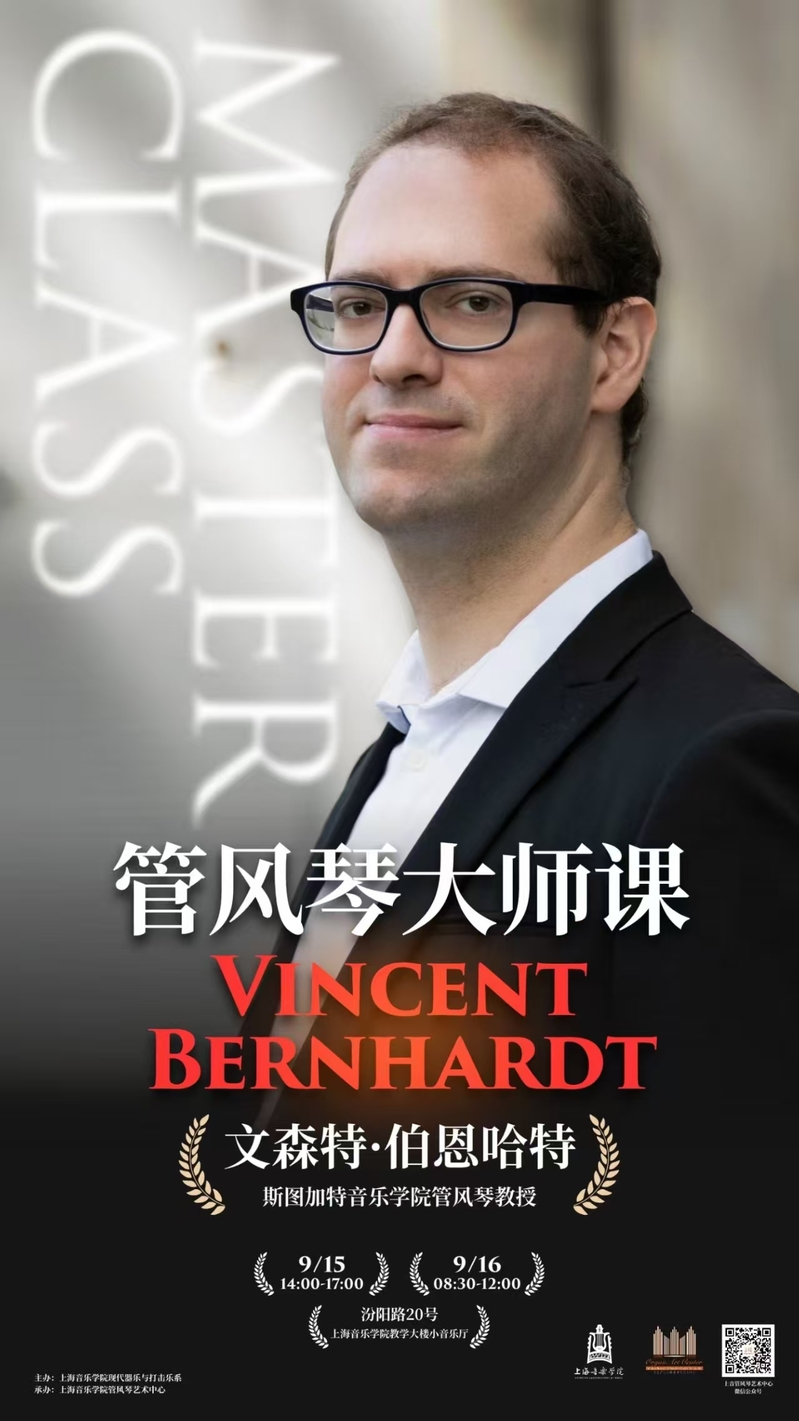 2025年9月15日至16日,德国斯图加特国立音乐和表演艺术学院管风琴教授及系主任文森特·伯恩哈特教授受邀于上海音乐学院小音乐厅举办大师课,同上音管风琴专业师生进行了学术交流,推动国内外管风琴文化的进一步交融。