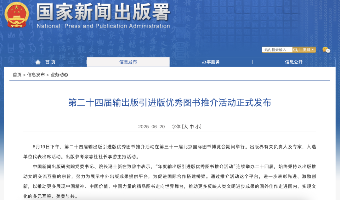 由中国新闻出版研究院、中国出版协会国际合作出版工作委员会、出版参考杂志社联合主办的“年度输出版引进版优秀图书推介活动” 连续举办二十四届,成为推动中外文化交流互鉴的重要平台。本活动旨在通过推介输出版和引进版优秀图书以及表彰杰出版权经理人,进一步推动中华文化走出去的提质增效,加强中国图书“走出去”和“引进来”的双向互动,为中外文化的繁荣发展贡献中国力量。