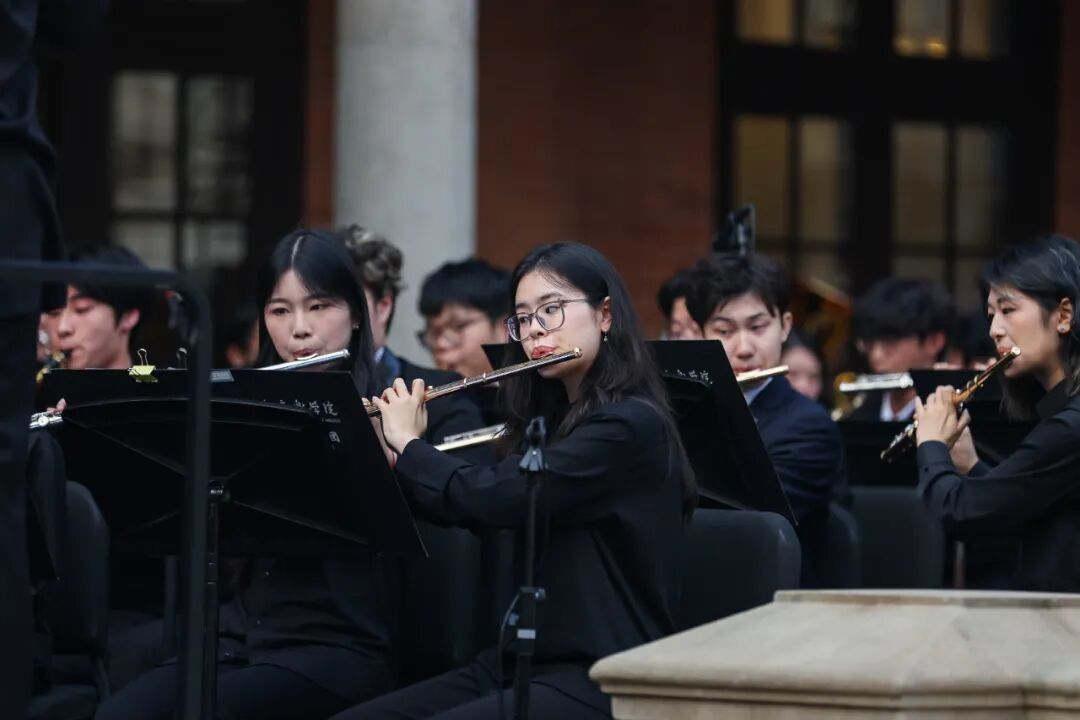 在指挥家程晔的执棒下,50余人的上海音乐学院交响管乐团以一曲气势恢宏的《红旗颂》拉开序幕,瞬间点燃现场的爱国热情。