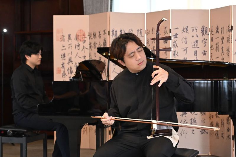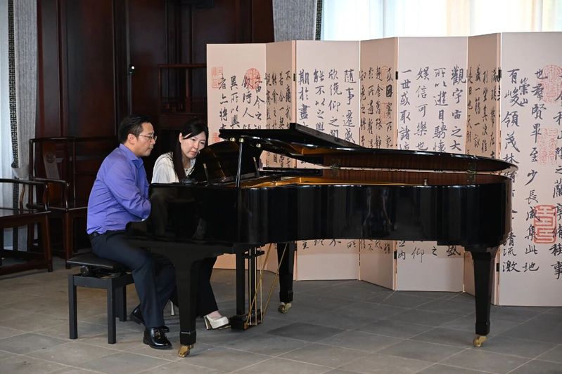 钢琴四手联弹《平湖秋月》(演奏:葛灏、汤声声)勾勒出西湖秋夜的静谧与澄澈,将月色与水波的交融演绎得淋漓尽致。四手联弹《我爱你中国》(演奏:刘晛飞、马子迪)以激昂而深情的旋律,奏响了对祖国母亲的无限热爱与赞美。