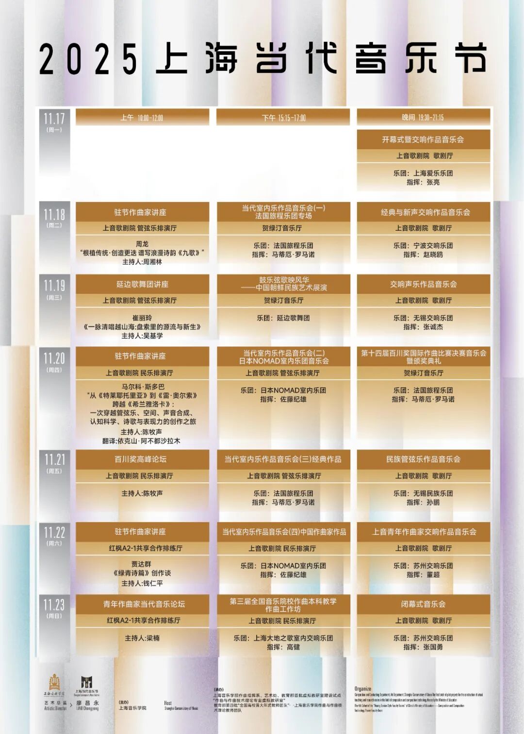 本届音乐节洋溢着蓬勃的青春气息。“上音青年作曲家交响作品音乐会”汇集九位本院青年教师创作的大型交响乐新作;在“经典与新声”等音乐会中,也为依克山、路芊辰等新生代作曲家提供展示平台。在演绎层面,音乐节汇聚了多位中国音乐金钟奖的获奖者以及青年演奏家与歌唱家,他们的精湛技艺将为新作增添光彩。这一“教创演研”深度融合的模式,正是对上海音乐学院办学特色的生动实践。