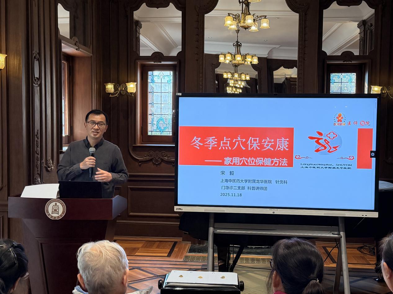 为关爱老同志的健康,加强日常保健,上音离退休党委、离退休工作处于2025年11月18日举办“家庭穴位保健方法”讲座,在党建共建单位龙华医院离退休党委的支持下,邀请到宋毅医生,他是上海中医药大学附属龙华医院针灸科副主任医师,中医针灸学博士,上海市卫健委首批“医苑新星”科普讲师,上海市中西医结合学会科普委员会青年委员,海派中医“陆氏针灸”传承研究主基地成员,上海援非摩洛哥医疗队分队长,从事针灸医疗、临床科研、科普教育多年。讲座由离退休党委书记、离退休工作处处长易慧主持。