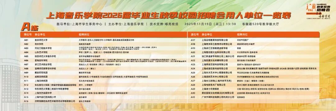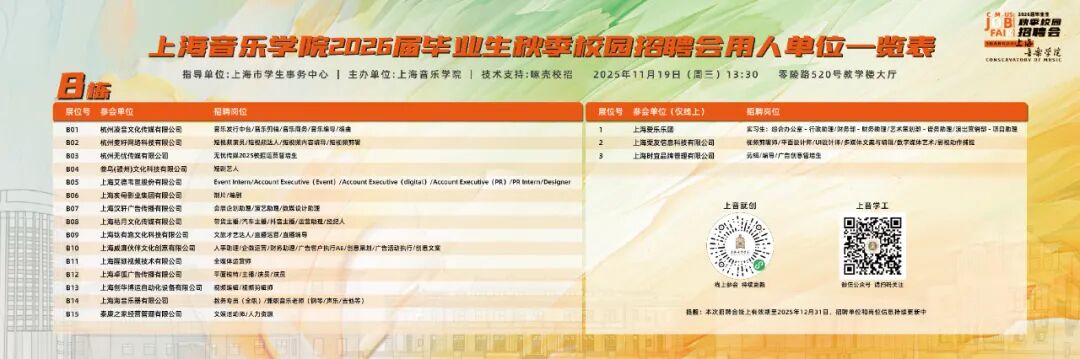 为进一步促进我校音乐艺术人才与市场供需的精准对接,推动2026届学校毕业生实现高质量充分就业,11月19日下午,上海音乐学院2026届毕业生秋季校园招聘会在零陵路举行。本次招聘会聚焦毕业生需求,近50家用人单位提供了146个岗位,招聘人数近700人。每家参会单位均配备独立线上展位,支持上传宣传海报、短视频等内容,全面展示岗位信息与企业风貌,拓宽就业信息传播渠道。用人单位包含高校、职业院团、新闻出版单位、互联网科技企业和文化传媒企业等。