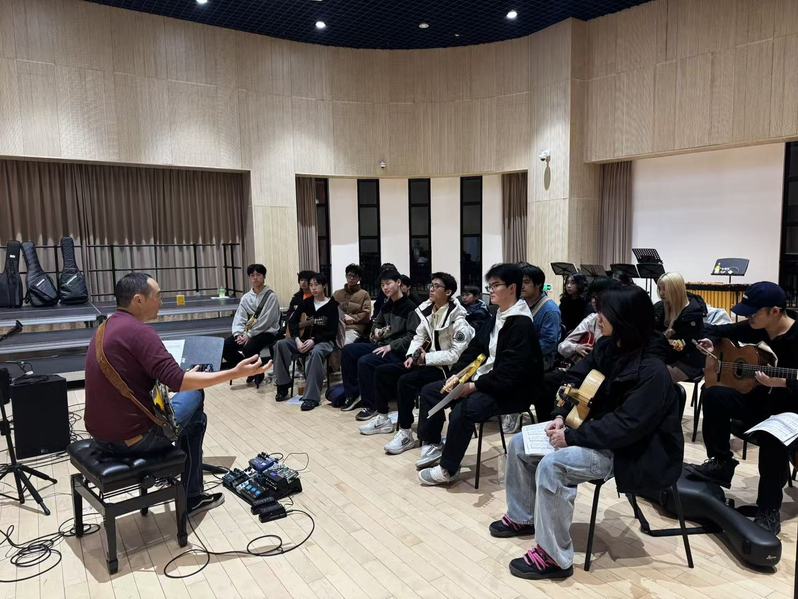 大师课上,顾忠山先生以真诚务实的分享风格,传递了现代音乐实践中的核心经验。课程聚焦三大关键主题—— 声部思维在现代音乐实践中的运用、流行音乐中吉他的音色把控与选择,以及与乐手合作时的伴奏技巧。他结合自身舞台演出与创作经历,通过经典曲目拆解、现场演奏示范、实时互动答疑等形式,从声部编排的逻辑构建、音色调节的细节技巧,到伴奏时的节奏适配与情感传递,进行了细致入微的讲解与指导,帮助学生们打通理论与实践的壁垒,在场师生均表示获益良多。