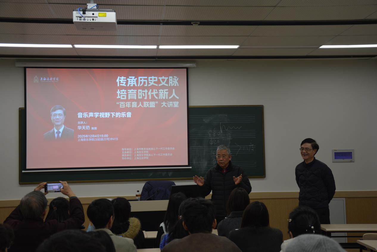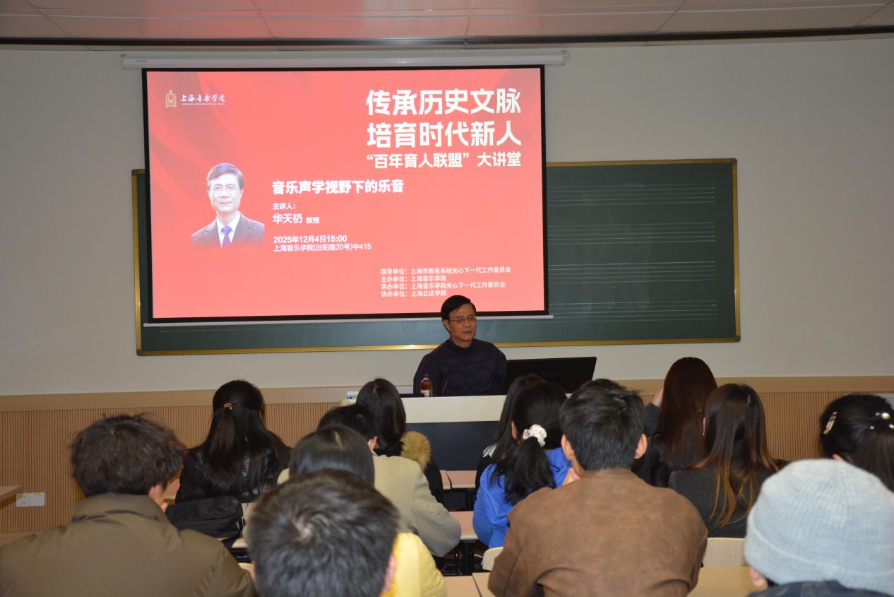 为深化“百年育人联盟”校际合作内涵,以音乐艺术为纽带搭建跨学科学习平台,2025年12月4日下午,上海音乐学院关工委精心策划的 “百年育人联盟”大讲堂系列活动顺利开展。本场活动以《音乐声学视野下的乐音》为主题,特邀上海音乐学院教授、关工委副主任华天礽担任宣讲嘉宾。上海电力大学和上海立信会计金融学院的近三十名师生受邀齐聚上音,在沉浸式参观与专业讲座的丰富体验中,开启一场融合艺术与科学的音乐探索之旅。上海电力大学关工委常务副主任石奇光,上海音乐学院关工委副主任兼秘书长易慧参加活动。