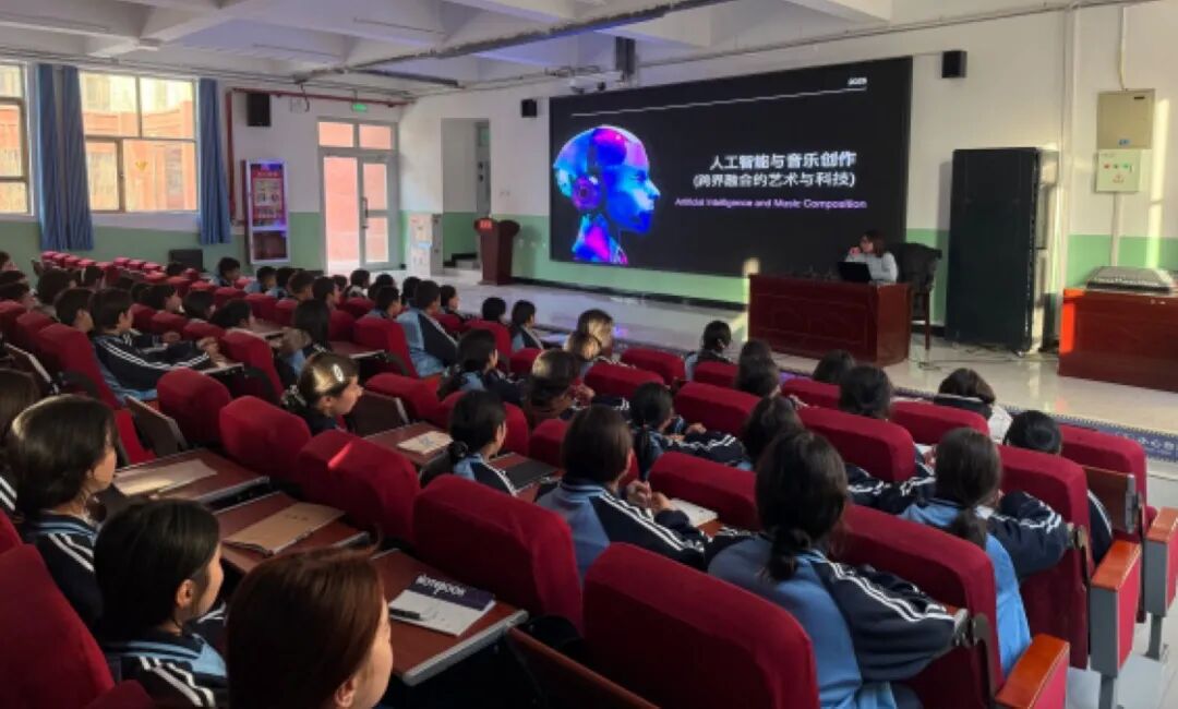 与此同时,上海音乐学院人工智能音乐疗愈重点实验室成员开展了以人工智能为主题的系列科普讲座,以人工智能为媒介推进文化润疆,不仅是技术知识的传递,更是视野的拓展与能力的培养。将前沿科技展示与文化价值观引导相结合,通过差异化、跨学段的内容设计,系统讲解了人工智能的技术原理、应用场景及使用方式。讲座结合现场演示与实际案例,直观呈现人工智能在学习、创作与生活中的应用,引导学生理性看待技术、树立科学使用意识,在“看得见、用得上”的体验中深化认知。活动不仅促进了人工智能知识在校园的普及,提升了学生科学素养,也为科技教育融合文化浸润提供了实践范例。