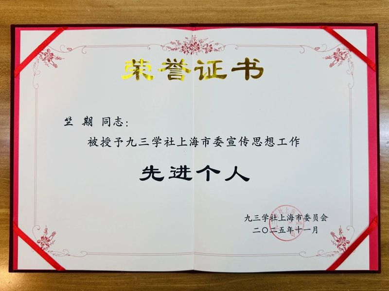 12月5日,九三学社上海市委2025年宣传思想工作会议在民主党派大厦召开。上海音乐学院音乐戏剧系副教授、硕士研究生导师、声乐教研室副主任竺期荣获九三学社上海市委宣传思想工作先进个人。