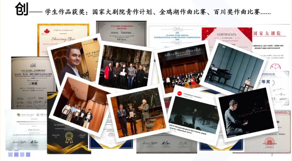在教学实践中,我秉持“教创演研一体化”人才培养模式,以培养“德艺双馨、红专兼备、国际视野、全面发展的拔尖创新艺术人才”为己任。在创新教学方面,提出两个教学理念:一是以思政贯穿全程的“1+4”作曲教学理念(强化专业基础训练);二是多学科协同模式下的作曲实践教学(加强应用与社会服务)。学生们在“创、演、研”多个维度取得丰硕的成果。在国际学生教学中,鼓励荷兰留学生夏炜烨(Xavier VAN DE POLL)以中荷文化为背景创作歌剧《高罗佩在中国》,本项目入选上海市重大文艺创作孵化项目。正如中国驻荷兰大使馆在推荐信中强调,这是一项具有重要文化意义的跨国艺术实践。