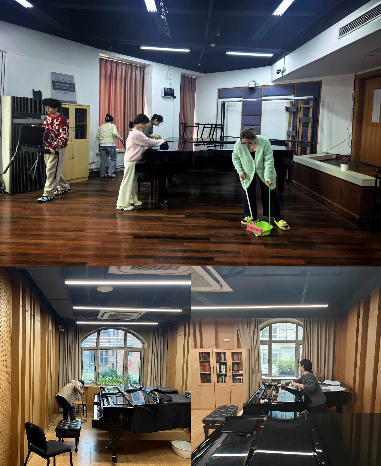 志愿者同学们化身“环境美容师”,细致清洁专业教室与琴房。同学们分工协作、细致擦拭,从琴键琴身到桌椅角落,为专业学习打造整洁雅致的环境,让悠扬琴声与文明新风相伴同行。