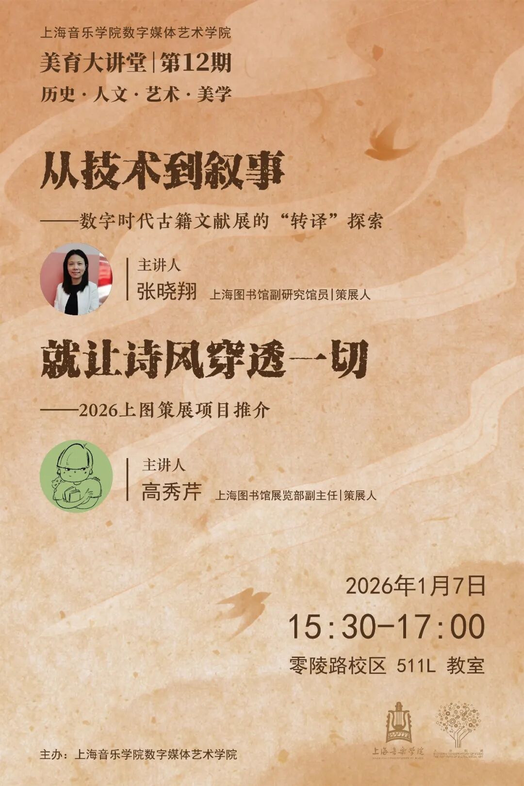 上海图书馆副研究馆员、策展人张晓翔老师将以上图策划的文献类展览为例,探讨数字媒体如何通过核心叙事、场景构建与互动设计,破解文献展览的阐释难题,实现古籍的创造性转译。上海图书馆展览部副主任、策展人高秀芹老师将推介2026上图新展“让诗风穿透一切——《诗经》草木意象展”,以上海图书馆藏16本《诗经》相关珍贵典籍为依据,串联《诗经》的传承脉络、名物研究、草木研究发展、海外传播等方面的知识信息,将经典文本视觉化,运用当代视觉语言解构经典文本,借草木意象喻人生四季,用《诗经》的经典文本观照当下情绪,建立一场跨越时空的对话。