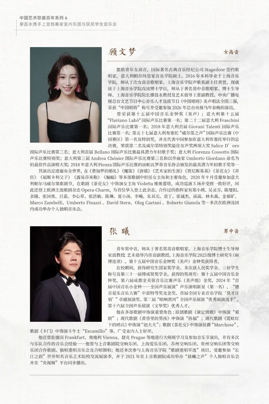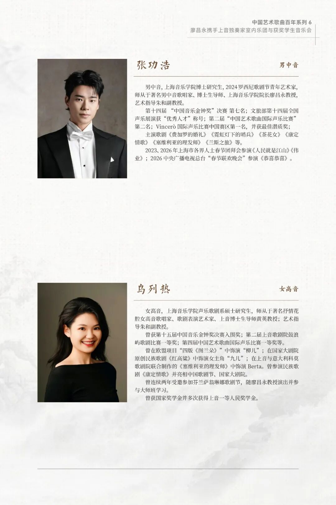四位青年声乐新星顾文梦、张曦、张功浩、乌列热将与廖昌永同台献唱。女高音顾文梦获第十五届中国音乐金钟奖美声组大奖,活跃于国内外各大艺术舞台;张曦在本科、硕士到博士的培养中,实现从合唱队到主要角色的提升,荣获第十五届金钟奖美声组金奖;张功浩作为第十四届金钟奖决赛入围者,多次参演上音原创歌剧,并登上欧洲罗西尼歌剧节的殿堂级舞台;蒙古族姑娘乌列热则在第四届中国艺术歌曲国际声乐比赛中摘得桂冠,展现出中国民族声乐的独特魅力。上音声乐人才辈出的背后,是上音深厚积淀与不断创新的培养机制。