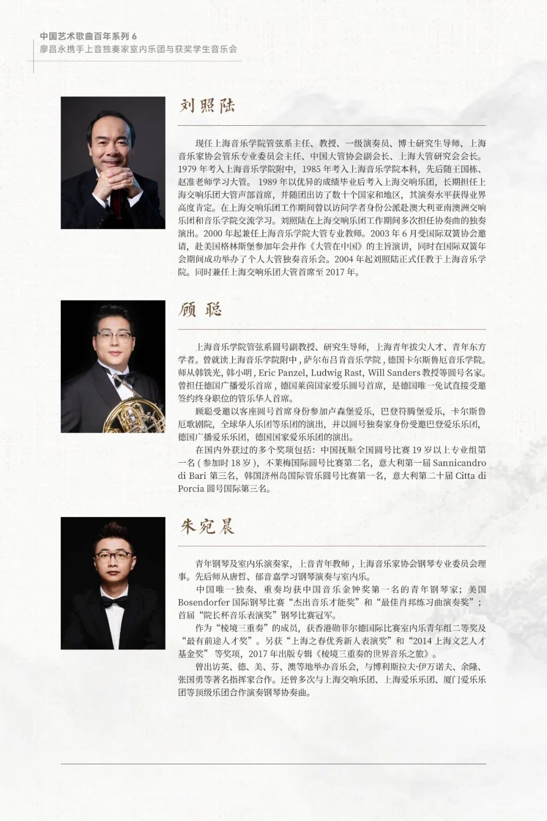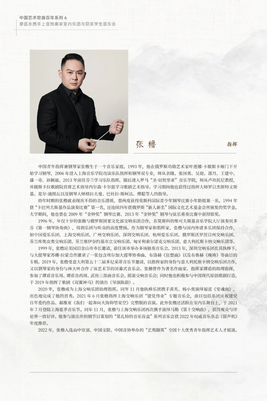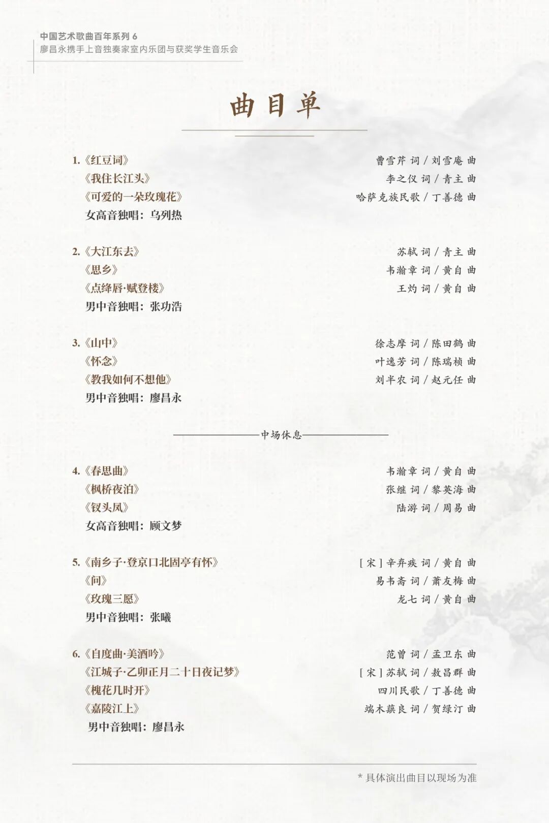 即将开启的这场中国艺术歌曲音乐会,汇集自20世纪20年代以来相关创作领域的19首经典之作。其词作文本或撷取古典诗词,或选自现代诗文,亦或源自民间歌谣,几乎涵盖中国艺术歌曲选词的所有主流方式;曲作风格方面则显示了几代作曲家们逐步摆脱德奥艺术歌曲风格模仿,通过将中西作曲技法与中国民族文化、语言韵律与传统旋律深度融合,寻觅出具有世界影响力的中国化路径之变迁。曲目涵盖《大江东去》(1920年)《问》(1922年)《教我如何不想他》(1926年)《春思曲集》三部作品(1932年)等极具代表性的佳作。试图在有限的时空场域里,为观众们重合再现这些艺术经典生成的重要时刻,并带领他们全面回望中国之声的百年求索之路。