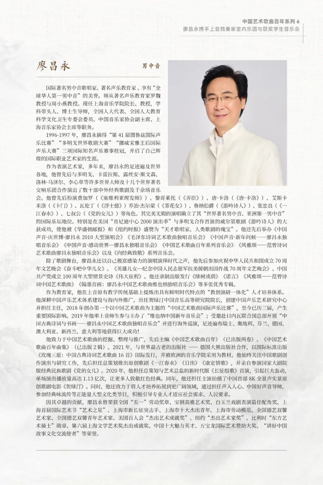4月6日晚,作为第41届上海之春国际音乐节重磅演出之一,“中国艺术歌曲百年系列”音乐会将连续第六年与沪上观众相约。上海音乐学院院长廖昌永将携四位声乐获奖学生顾文梦、张曦、张功浩、乌列热,由指挥家张橹执棒首次亮相该系列的“上音独奏家室内乐团”,为中国艺术歌曲这一传统上由钢琴伴奏主导的载体,注入精致且具交响性的全新织体,集中呈现上海音乐学院近年来在中国艺术歌曲百年历史挖掘整理以及推广育人上的阶段成果。