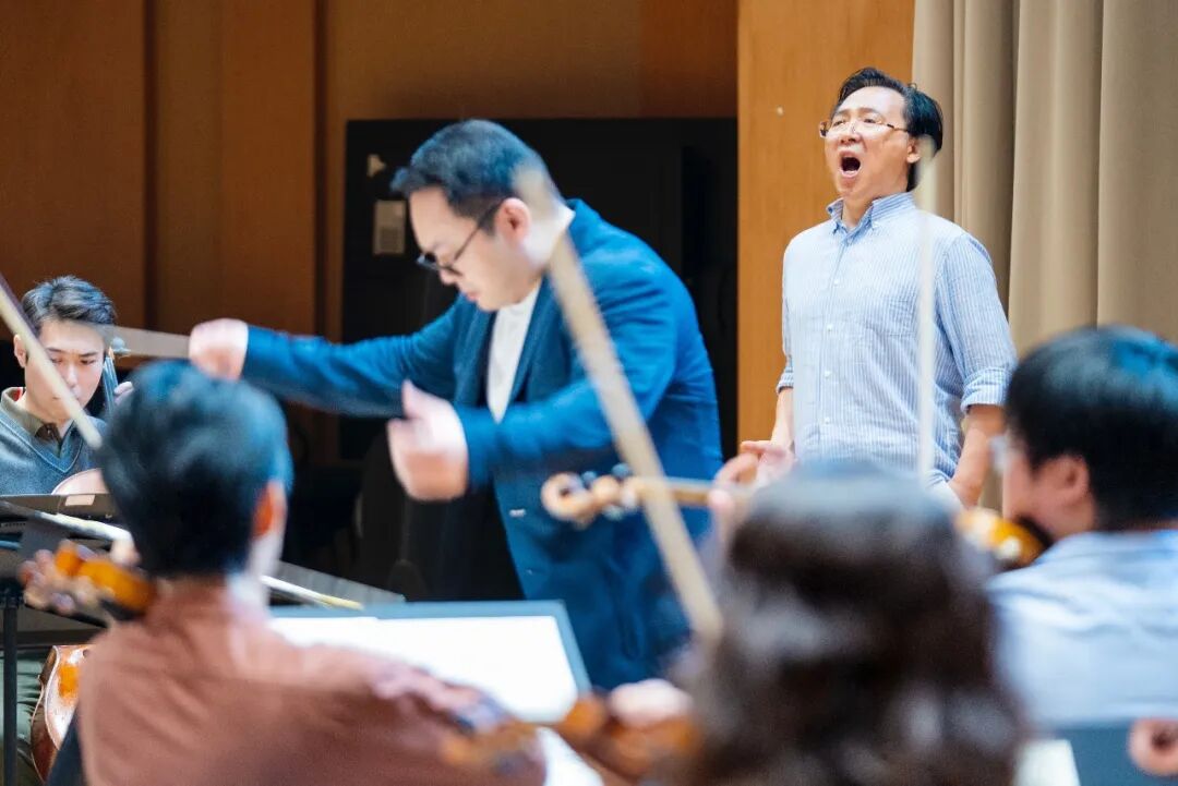 今天(4月4日)下午,廖昌永利用假期与上音独奏家室内乐团进行了一场高强度排练,为即将到来的音乐会做准备。廖昌永一口气走完了7首曲目,包括《山中》《江城子》《怀念》《槐花几时开》等,并不时停下来与指挥张橹进行沟通。《山中》旋律轻盈简洁、意境空灵静谧,沉静又略带感伤;《江城子》的旋律写作与和声递进则更显“古风音乐”风格;《怀念》充满东方意蕴与柔情,如泣如诉地表达了对故人的思念之情;另外一首《槐花几时开》,其旋律改编自四川宜宾地区的一首高腔山歌,令人耳目一新。