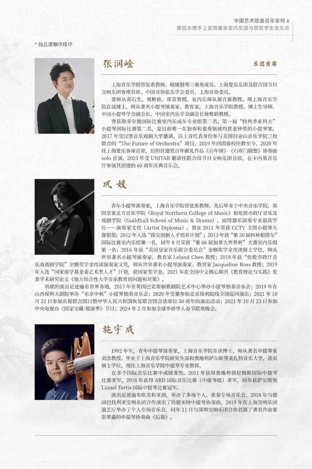 上音在中国艺术歌曲领域的系统性布局早已有之。2017年,上海音乐学院成立中国声乐艺术研究中心,以廖昌永为学术带头人的团队,通过“中国艺术歌曲百年”系列研究、中国艺术歌曲国际声乐比赛、学术论文征集等学术实践,构建起集创作、表演、研究、传播于一体的完整学科生态。此前,廖昌永曾与钢琴家合作呈现中国艺术歌曲项目并开启海内外巡演,而此次上海演出则尝试引入室内乐团模式,被视作中国艺术歌曲项目的拓展演化。
