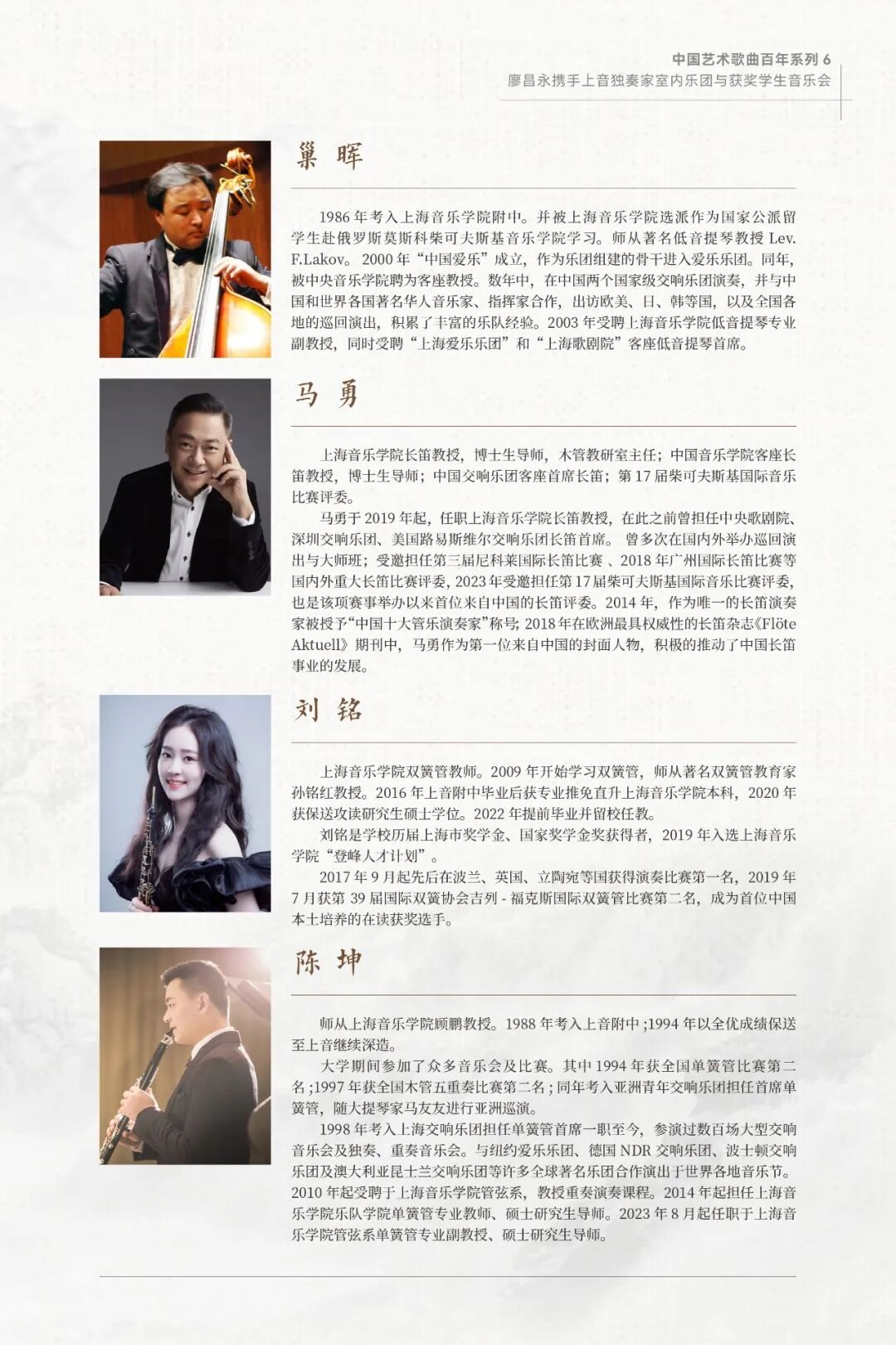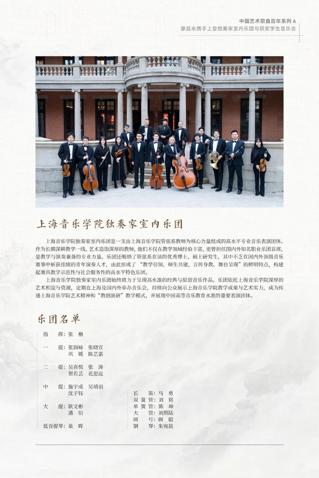 在中国艺术歌曲的百年版图上,钢琴始终扮演着不可或缺的角色。从青主、黄自到赵元任,作曲家们以钢琴织体构建起诗词对话的音乐空间。然而,4月6日的这场音乐会试图打破这一惯性思维。此次担纲器乐部分演绎的上音独奏家室内乐团,是一支由上海音乐学院中青年骨干教师、博士及优秀学生组成的高水平室内乐演奏团体,致力于中国艺术歌曲与中外经典作品的创新编演。乐团汇集了上音管弦系主任、大管演奏家刘照陆教授,长笛演奏家马勇教授,圆号演奏家顾聪副教授,低音提琴演奏家巢晖副教授,单簧管演奏家陈坤副教授以及青年教师张润崯、巩媛、施宇成、耿文彬、朱宛晨、潘衍、刘铭以及博士生沈子钰等。这支乐团的成立和亮相,是上海音乐学院深化教育教学改革的重要体现,兼具教学延伸功能,从独奏到室内乐全方位培养,师生同台实践,言传身教贯穿始终。