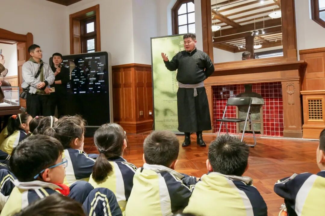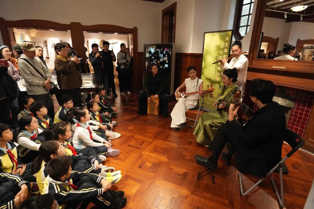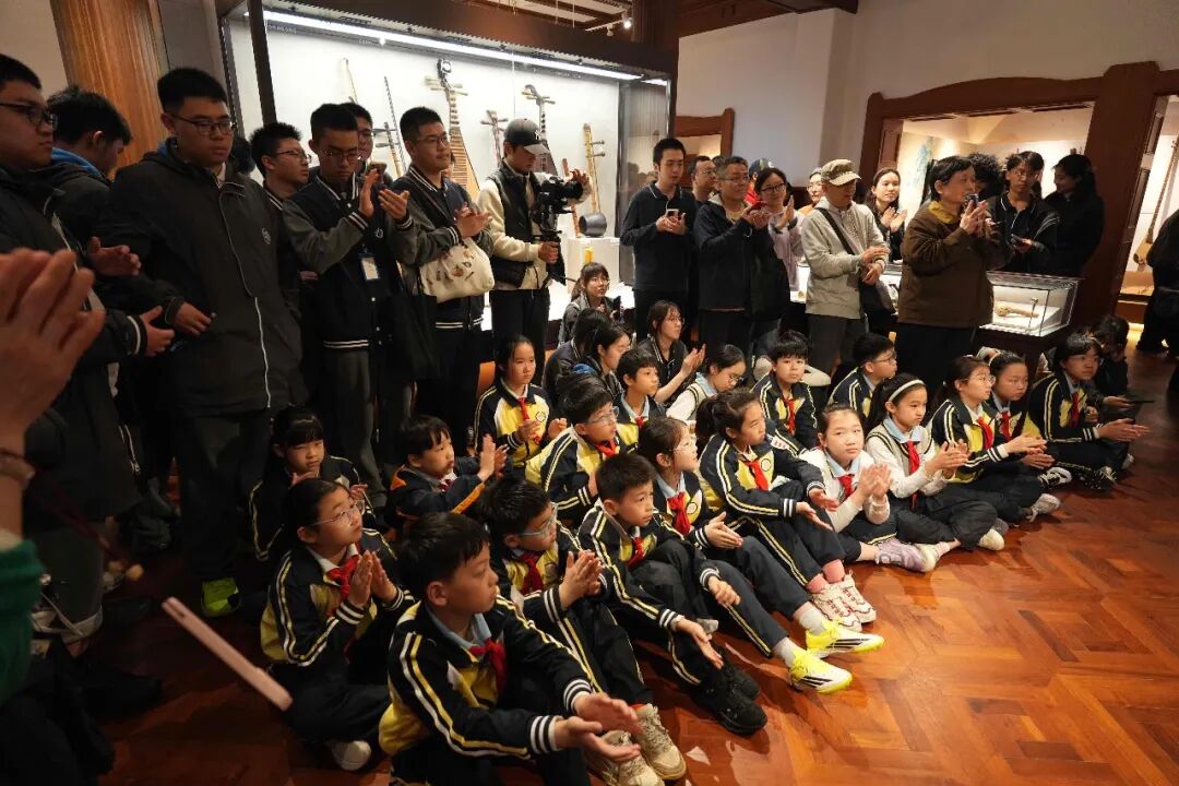 当天中午,尽管阴雨绵绵,本场演出也以“导赏+演奏”的形式,在上音东方乐器博物馆火热开展。作为第 41 届上海之春国际音乐节上音音乐开放周系列活动之一,本次沉浸式展演邀请了贵州黔西南州布依八音坐唱、西北果洛民族乐器弹唱、北方内蒙古呼麦等表演者齐聚一堂,为复旦附中徐汇分校、徐汇区第一中心小学的学生及众多上海市民,生动展现中华民族多元音乐文化的独特魅力。