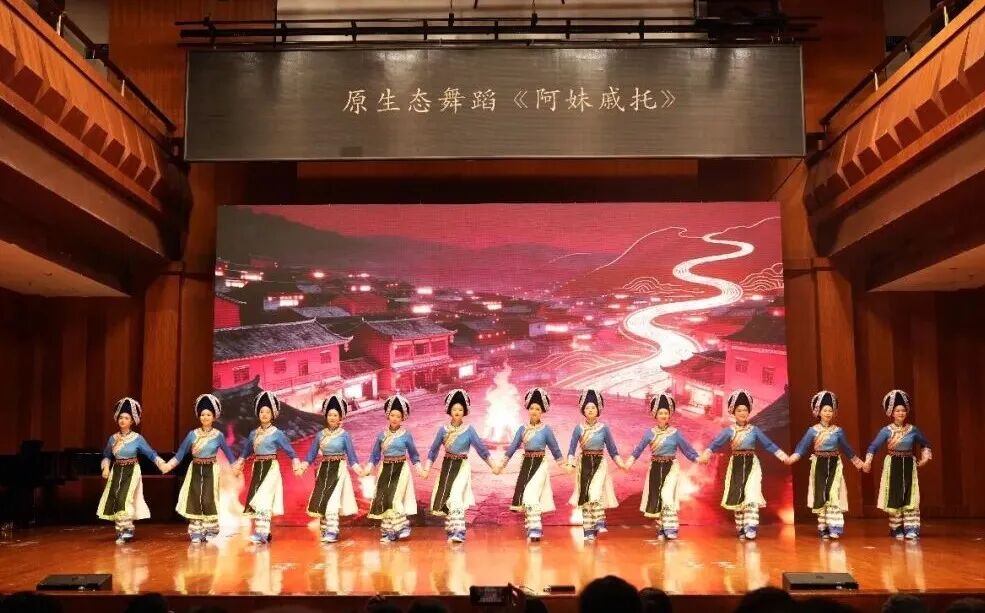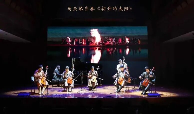 音乐会紧扣民族团结进步主题,让多民族艺术瑰宝在舞台上精彩绽放、互鉴交融。一曲打击乐《云之南》描绘云南火把节的狂欢盛景,为音乐会拉开序幕;国家级非遗民族舞蹈《阿妹戚托》以铿锵踢踏叩击心扉,贵州黔西南州的八音坐唱《贺喜堂》以婉转丝竹传递喜悦,蒙古草原马头琴演奏的《初升的太阳》勾勒草原辽阔,新疆地区冬不拉弹唱《黑眼睛》诉说民族深情,《潘吉尕木卡姆》片段展现古老乐舞的独特魅力。
