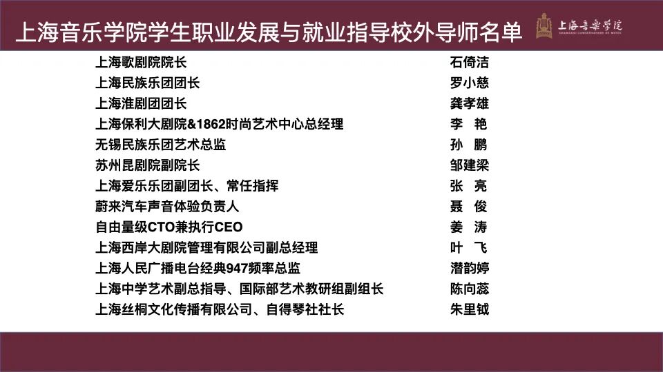 上海音乐学院学生职业发展与就业指导校外导师名单