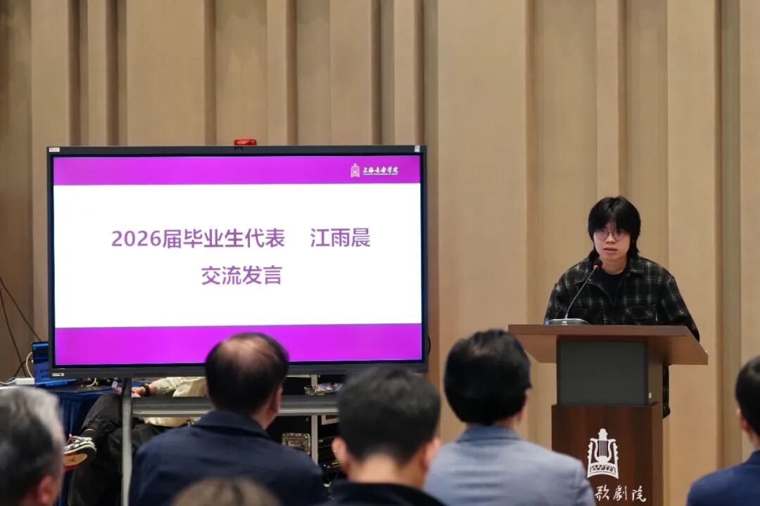 音乐工程系2026届毕业生江雨晨同学作为毕业生代表发言,她已成功签约南芯半导体科技有限公司,其跨领域就业的经历生动诠释了学校复合型人才培养的成果。