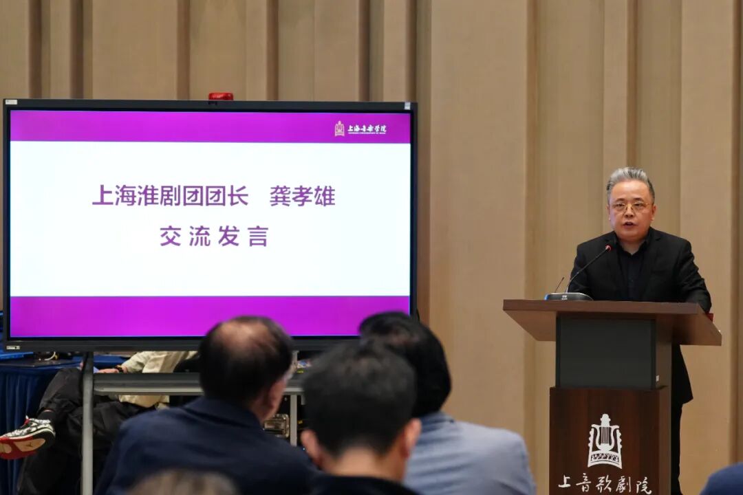 在交流发言环节,实习基地代表保利尚悦湾(上海)剧院管理有限公司人事行政经理陆琦、校外导师代表上海淮剧团团长龚孝雄,分别从用人单位和行业导师的角度,分享了对于艺术人才培养与校企协同育人的见解。