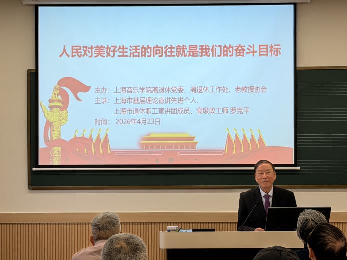 为深入学习贯彻习近平总书记关于树立和践行正确政绩观的重要论述,全面落实党的二十届四中全会精神,2026年4月23日上午,上海音乐学院离退休党委、离退休工作处联合老教授协会,举办“人民对美好生活的向往就是我们的奋斗目标”专题讲座。讲座由离退休党委书记、离退休工作处处长易慧主持。