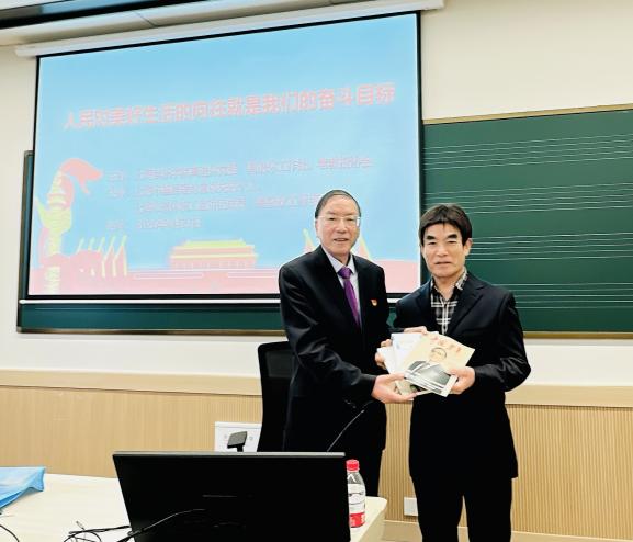 讲座伊始,主讲人罗克平同志赠送了两本自己的著作,以及一本以他为封面人物的《中国老年》期刊,以书香传递思想、凝聚共识。由离退休党委副书记、老教授协会秘书长李明明作为上音老同志代表,上台接受了赠书。