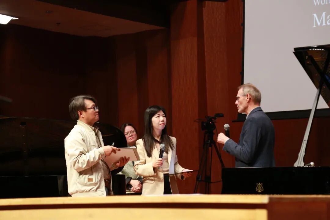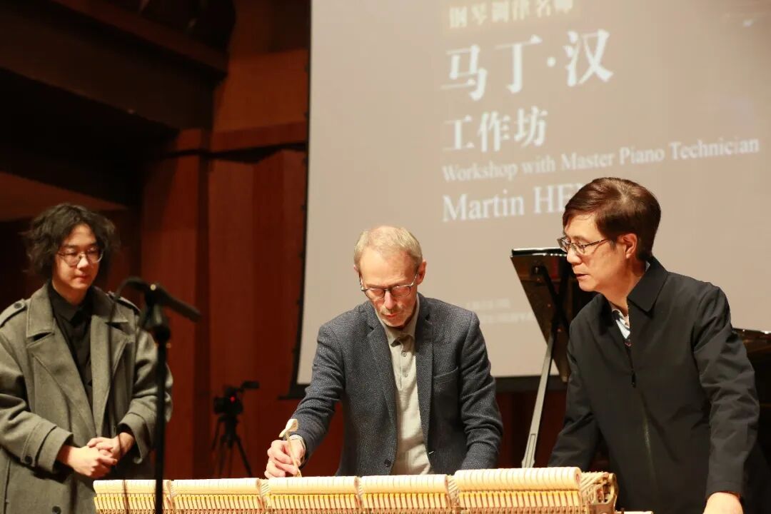 当天上午,席夫长期合作的德国调律大师马丁·汉(Martin Henn)还举办了钢琴调律工作坊,先与乐器修造专家华天礽教授对谈,再由孙麒麟博士担任解说翻译。马丁强调,调律须根据场地声学、环境温湿度及演奏者个人触感动态调整,提醒学生与调律师沟通时务必明确表达对音色与触感的具体需求。