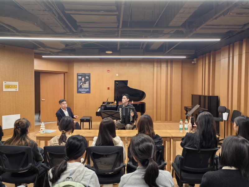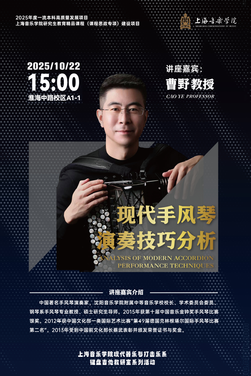 2025年10月22日,上海音乐学院现代器乐与打击乐系主办的“现代手风琴演奏技巧分析”专题讲座在淮海中路校区A1-1教室举行。本次讲座由张妍副教授主持,特邀沈阳音乐学院附中校长、手风琴专业教授曹野主讲,为学生带来了一场关于手风琴演奏技法的深度对话。