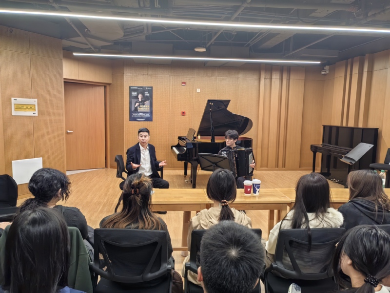 曹野老师在讲座中详细讲解了手风琴演奏的多个关键技巧,包括指法的运用、手指的触键、风箱的控制以及音乐层次的表达进行深入的讲解和分析,通过两位同学的实际演奏,也让⼤家对现代手风琴技巧有了更立体的认识。指法运用上,曹老师强调了指法的合理性对于演奏流畅性和效率的重要性,结合不同风格曲目分析指法与音乐织体、节奏的关联。手指触键决定音色质感,曹老师通过示范展示不同触键的音色差异。同时强调“触键力度层次感”,通过手腕微调控制发力,实现音乐情绪的自然过渡。风箱控制方面,曹老师指出风箱控制对于手风琴演奏至关重要,不仅仅是为了制造音量,更是为了表达音乐的情感和动态变化。音乐表达上,曹老师提出音乐的表达是演奏的核心,他鼓励学生们用心去感受音乐,用耳朵去判断,而不是单纯地追求技术上的完美。